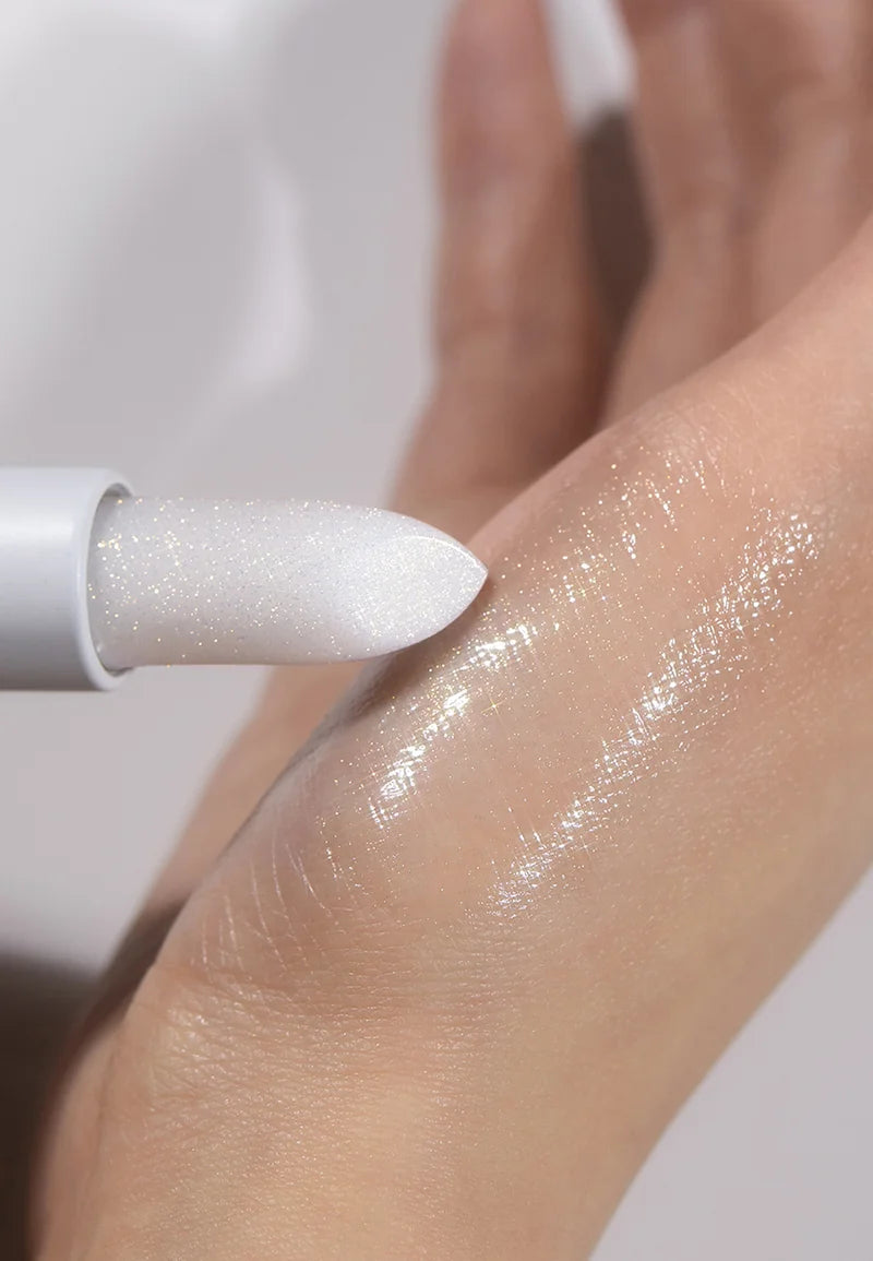 A premium, vegan-friendly lip balm that merges care and radiance. It features a clear base set with shimmering gold pearls to create a subtle, luminous finish.
